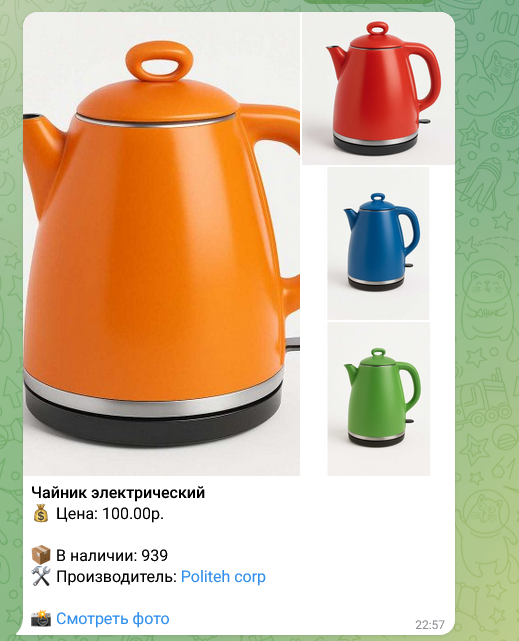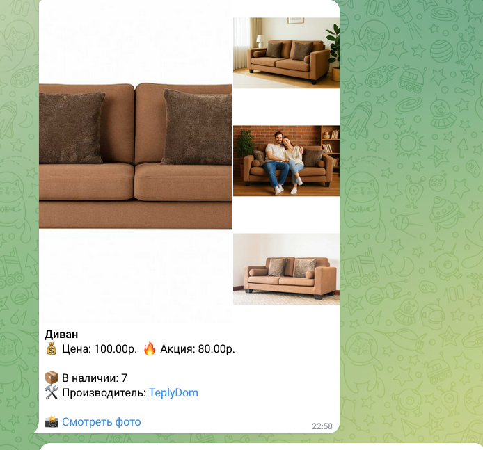 Модуль поддерживает полноценное оформление сообщений: название товара, цена, акция, наличие на складе, производитель, описание, главное изображение, галерею товара и кнопку «Открыть на сайте».