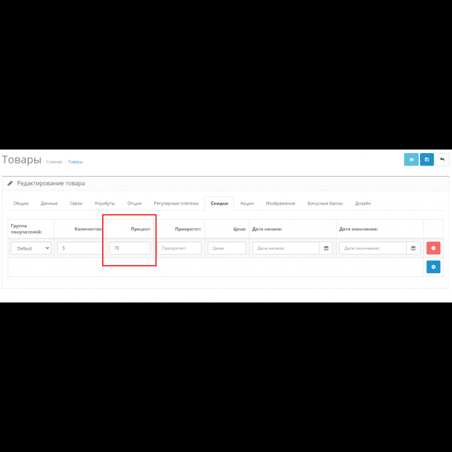 - Однократная настройка процента скидки: Достаточно один раз настроить процент, и модуль будет вычислять его от цены товара.