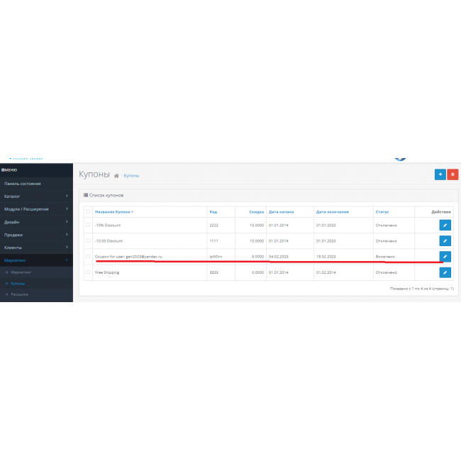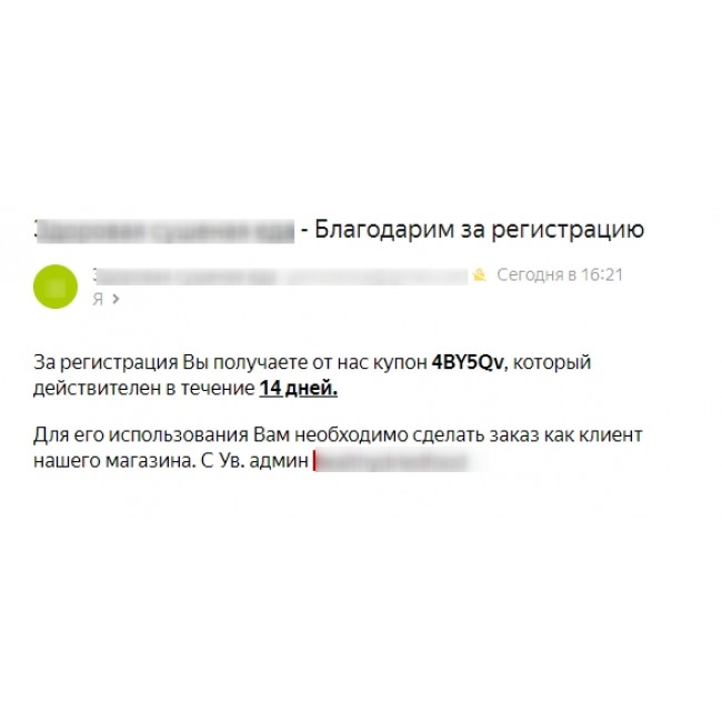 При регистрации каждому клиенту отправляется дополнительное письмо с текстом указанным в админке и созданным купоном.