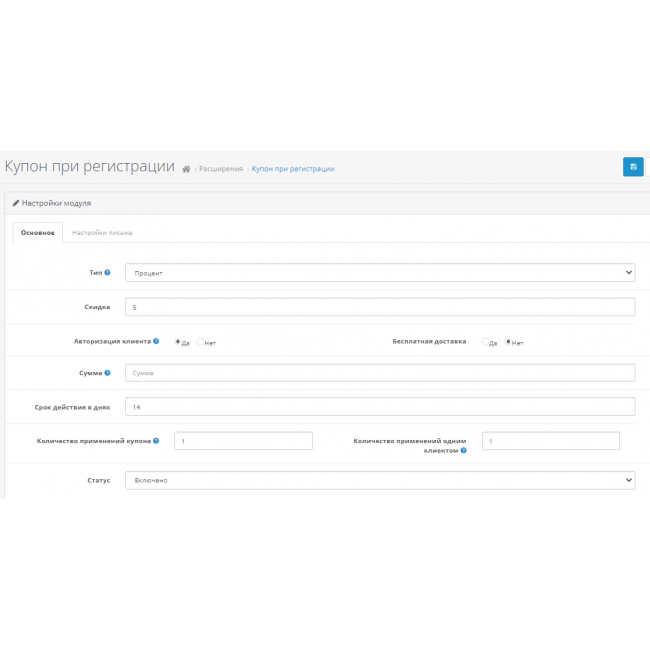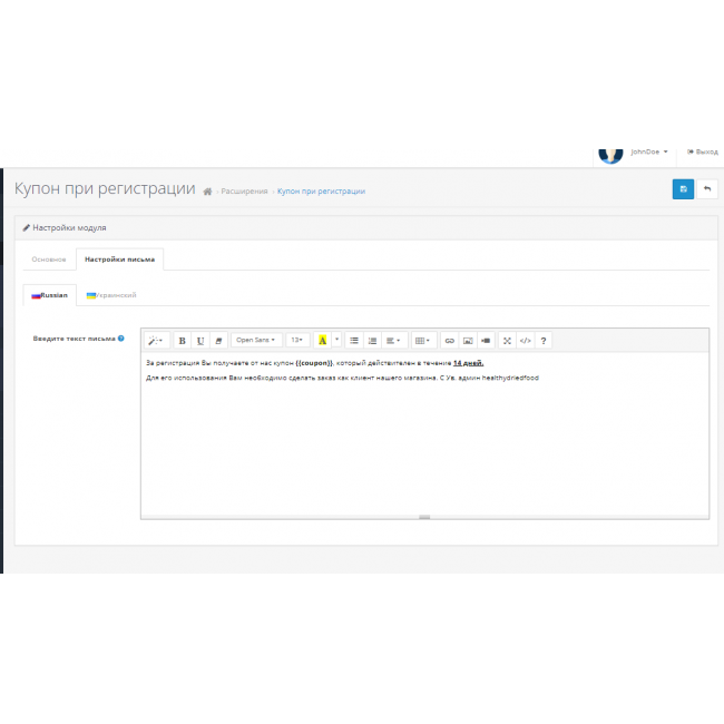 в настройках модуля можно ввести текст письма, и указать настройки для использования купонов.