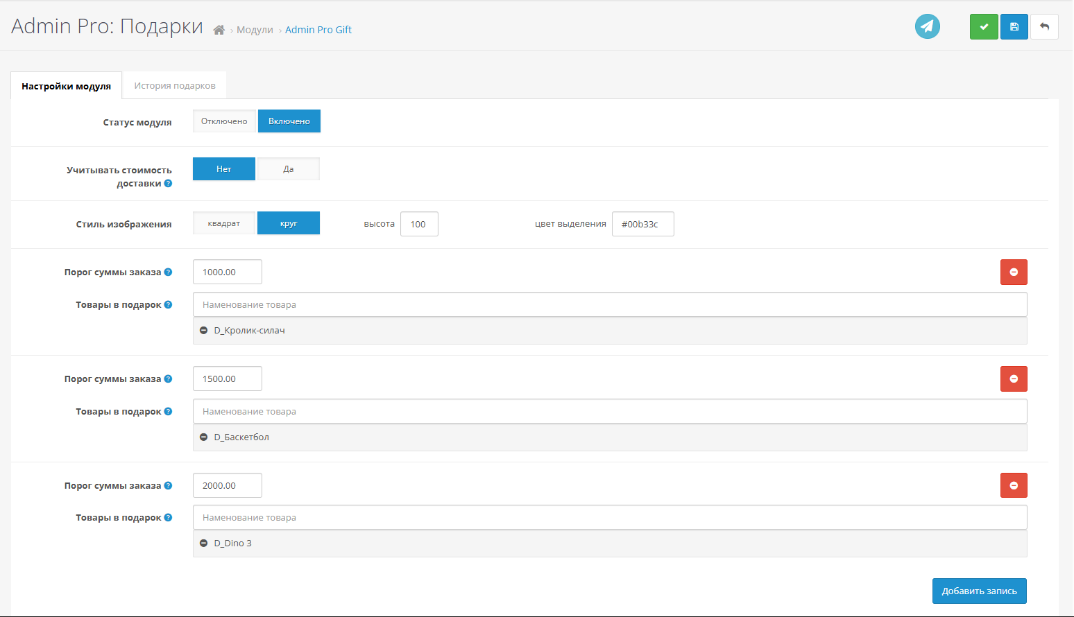 - Добавьте предел суммы заказа и товар-подарок при превышении указанной суммы.