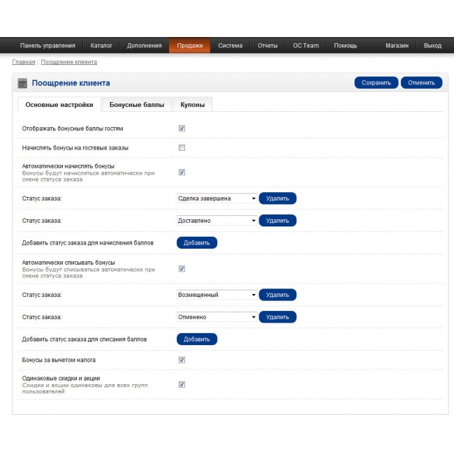 - Возможность запрета на одновременное использование баллов и купонов при оформлении заказа
