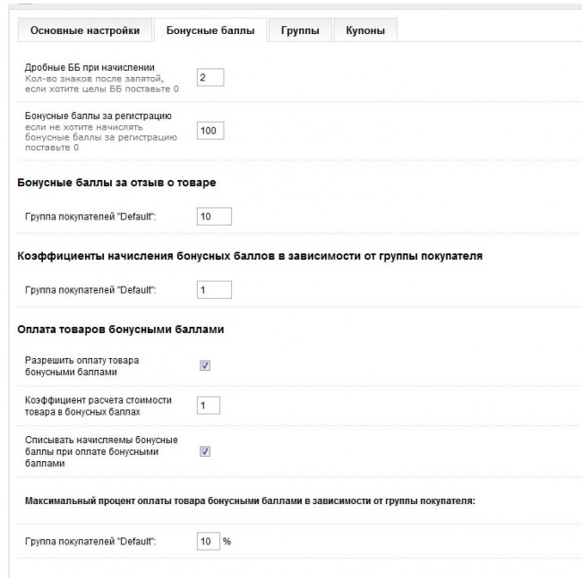 - Возможность ограничить размер оплаты заказа бонусными баллами в процентном соотношении к реальным деньгам (для каждой группы свой процент)