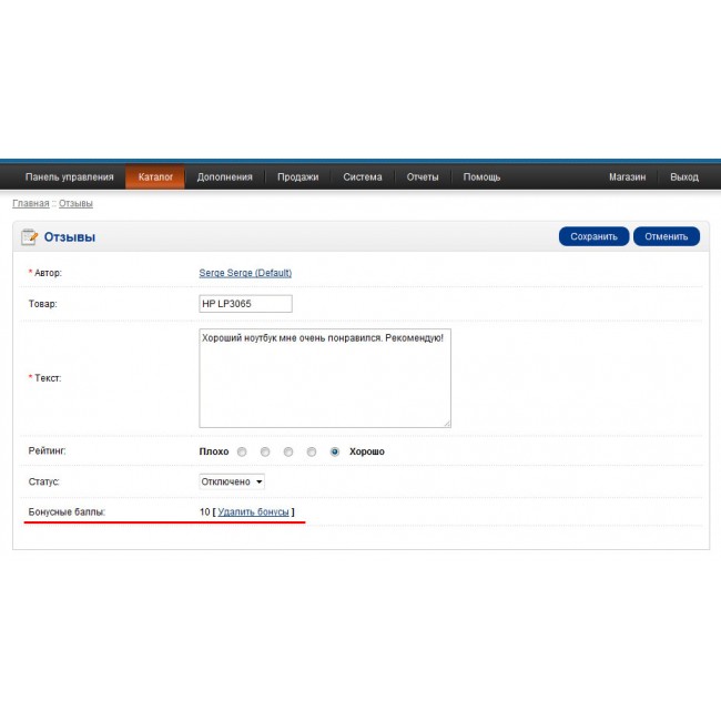 - Начисление бонусных баллов за отзыв о товаре (для разных групп покупателей можно установить свое значение)