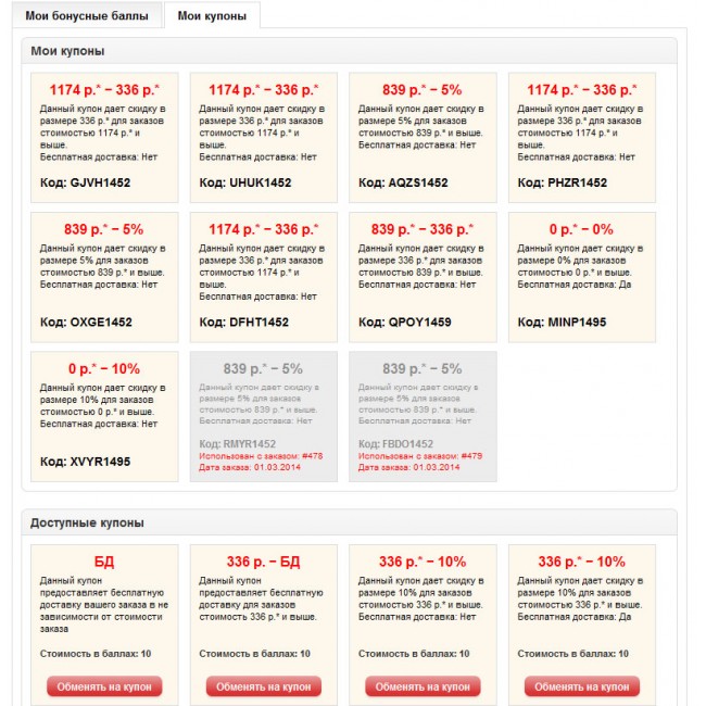 - Возможность обменивать бонусные баллы на персональные купоны в личном кабинете (стандартные купоны работаю без изменений)