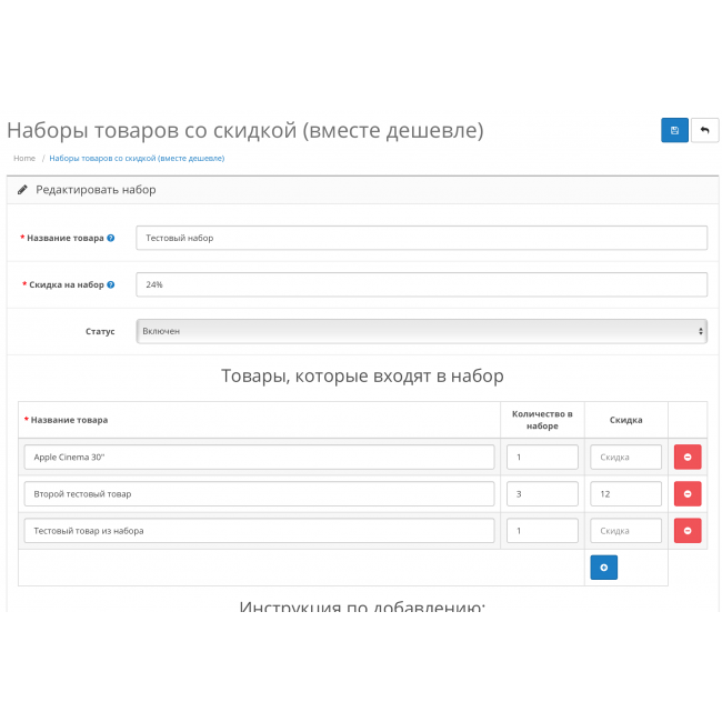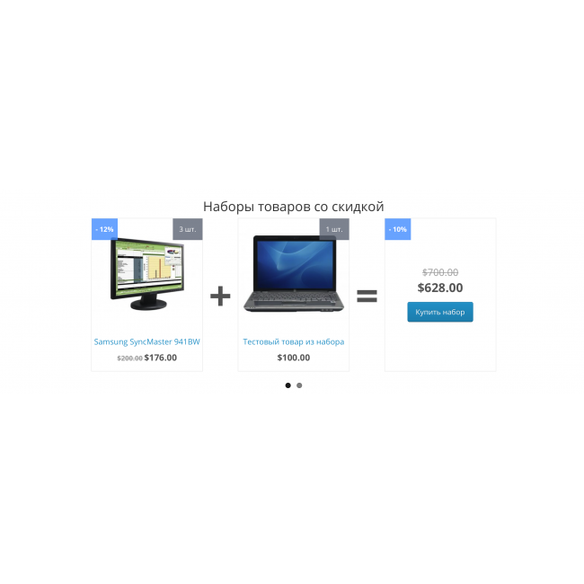 Модуль расширяет стандартные возможности OpenCart, позволяя создать наборы из нескольких товаров и установить скидку на созданный набор.