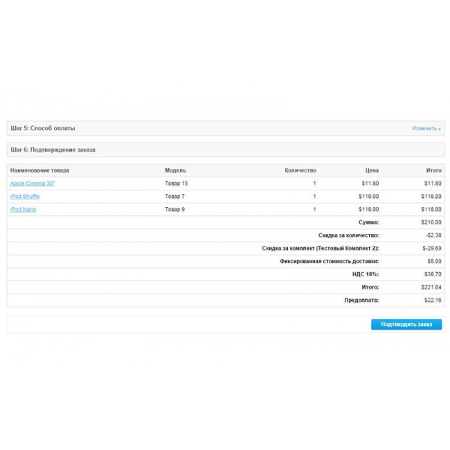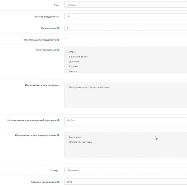 - привязка к методам доставки, при которых рассчитывается предоплата.