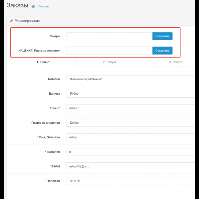 Модуль дает возможность добавить отложенную скидку и наценку вручную менеджером магазина в админ панели при редактировании заказа, тем самым уменьшить или увеличить стоимость отредактированного/созданного заказа.