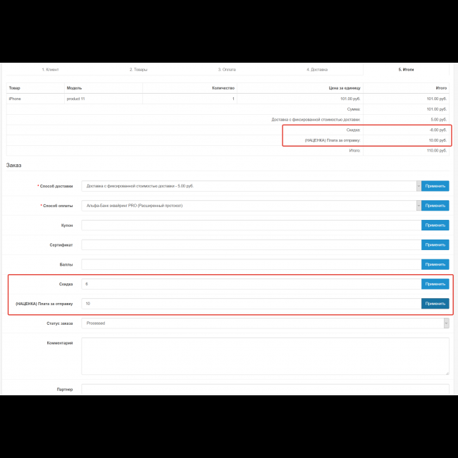 Скидка и наценка прописывается отдельным полем в списке заказа.