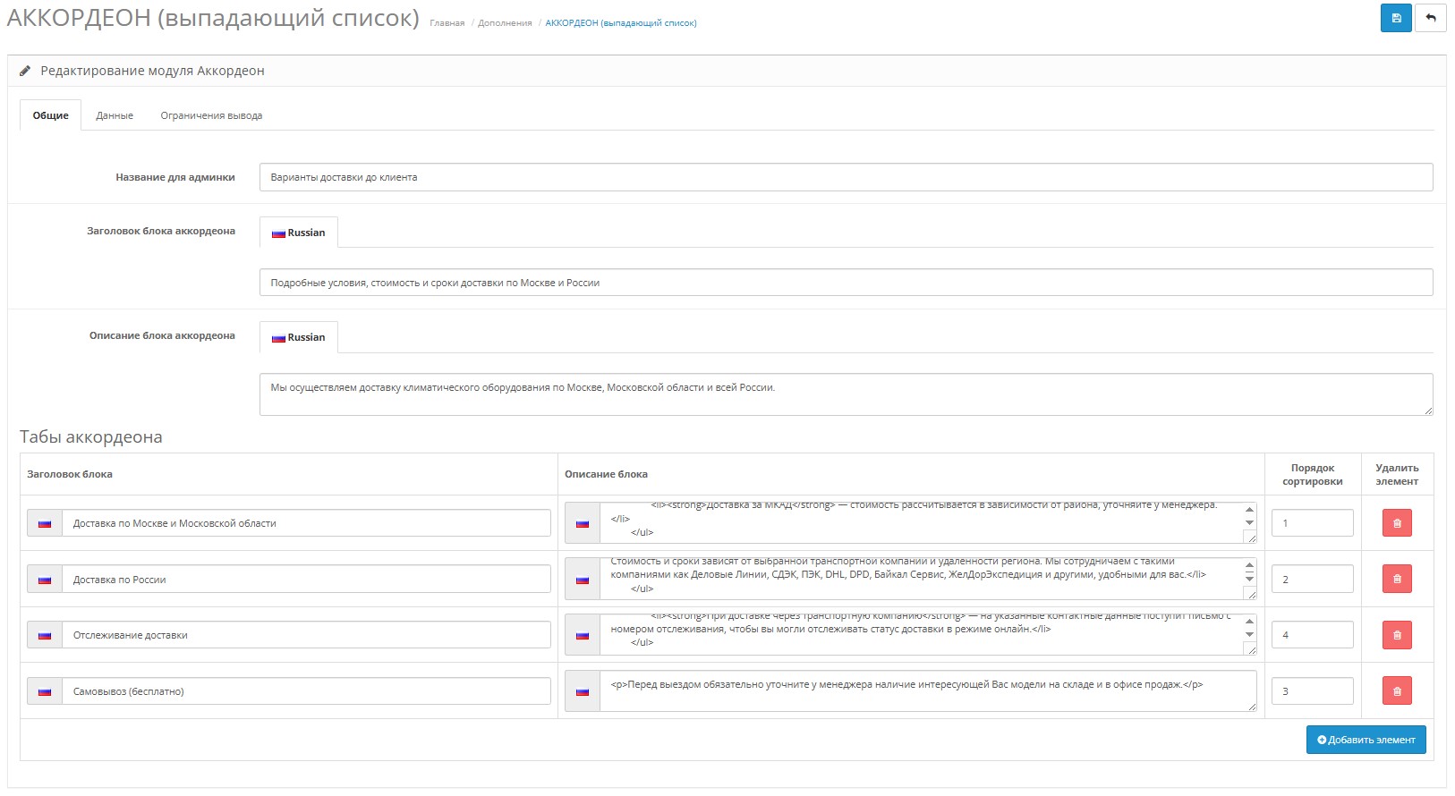 - Создайте вкладки (табы) аккордеона: впишите заголовки и описания, укажите сортировку.