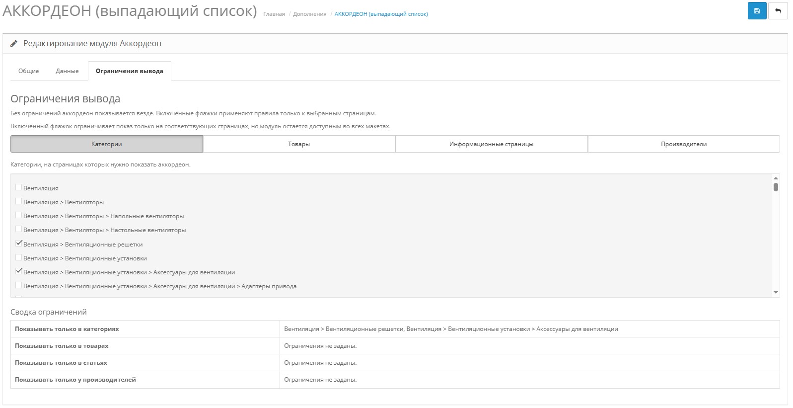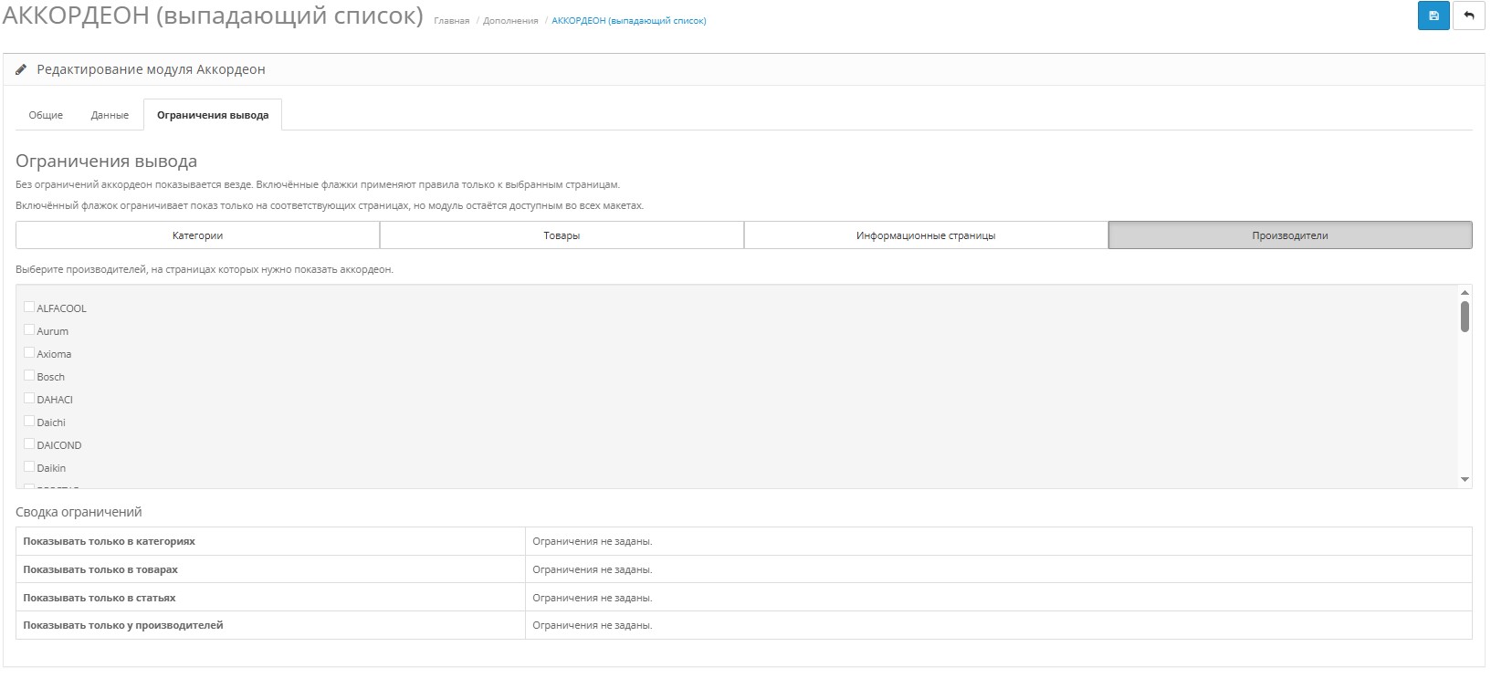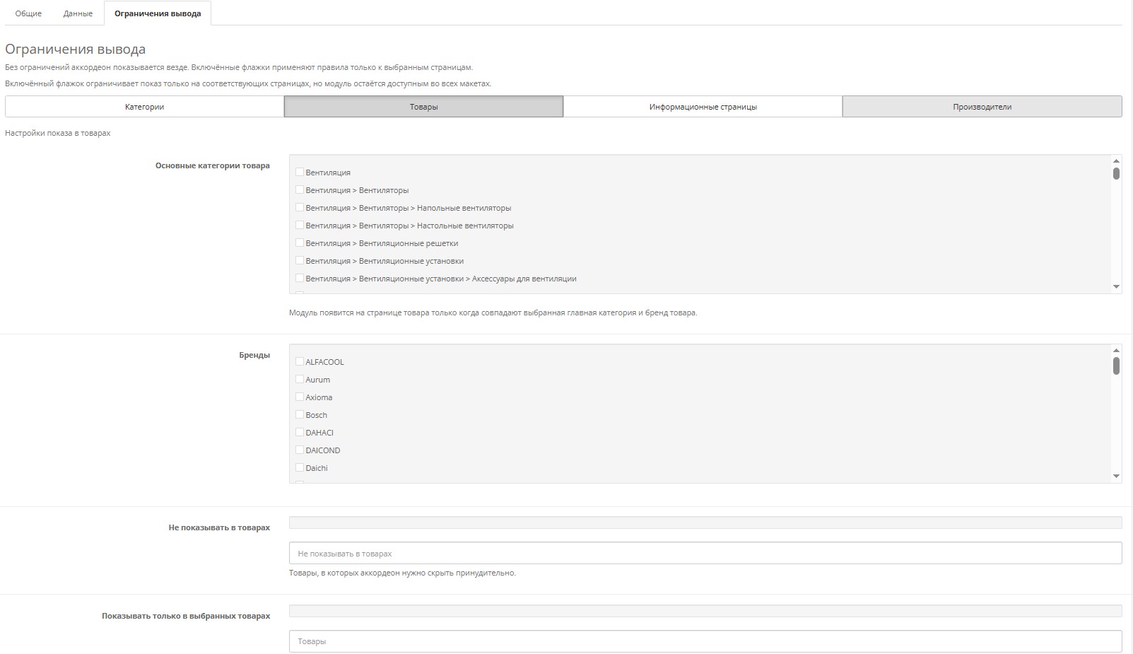 Ограничения помогают выводить модуль только там, где нужно: по категориям, товарам, производителям, информационным страницам или через отдельный список исключений. Включите нужные вкладки в разделе «Ограничение вывода», чтобы не плодить аккордеон на ненужных страницах.
