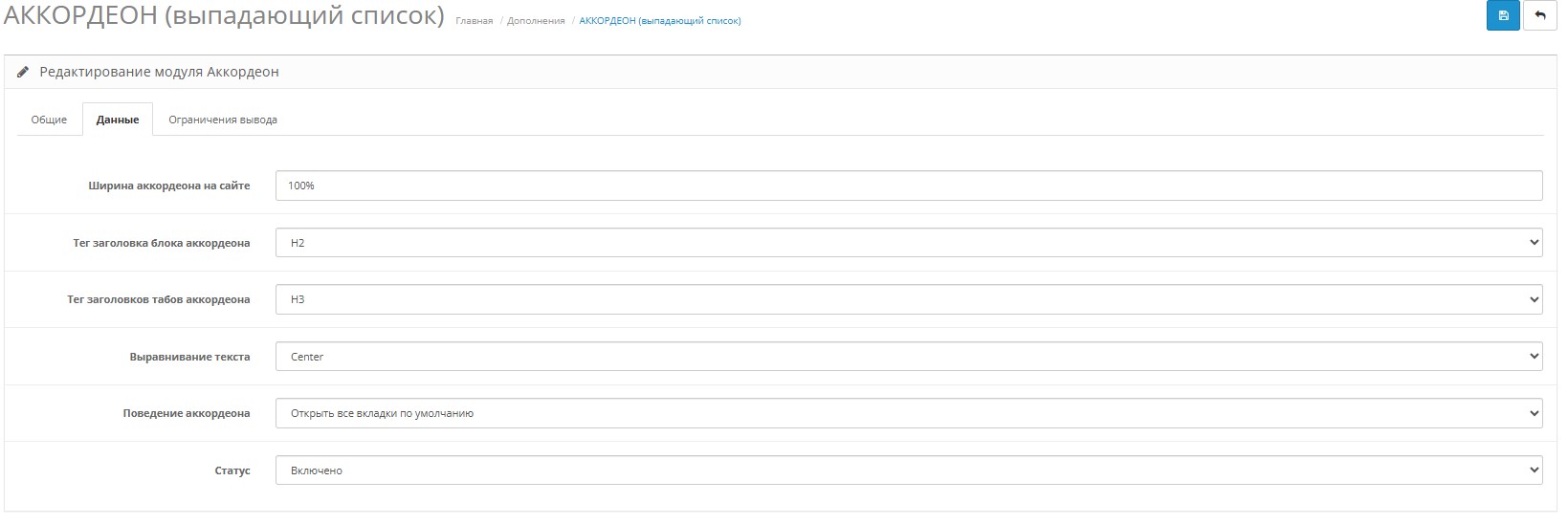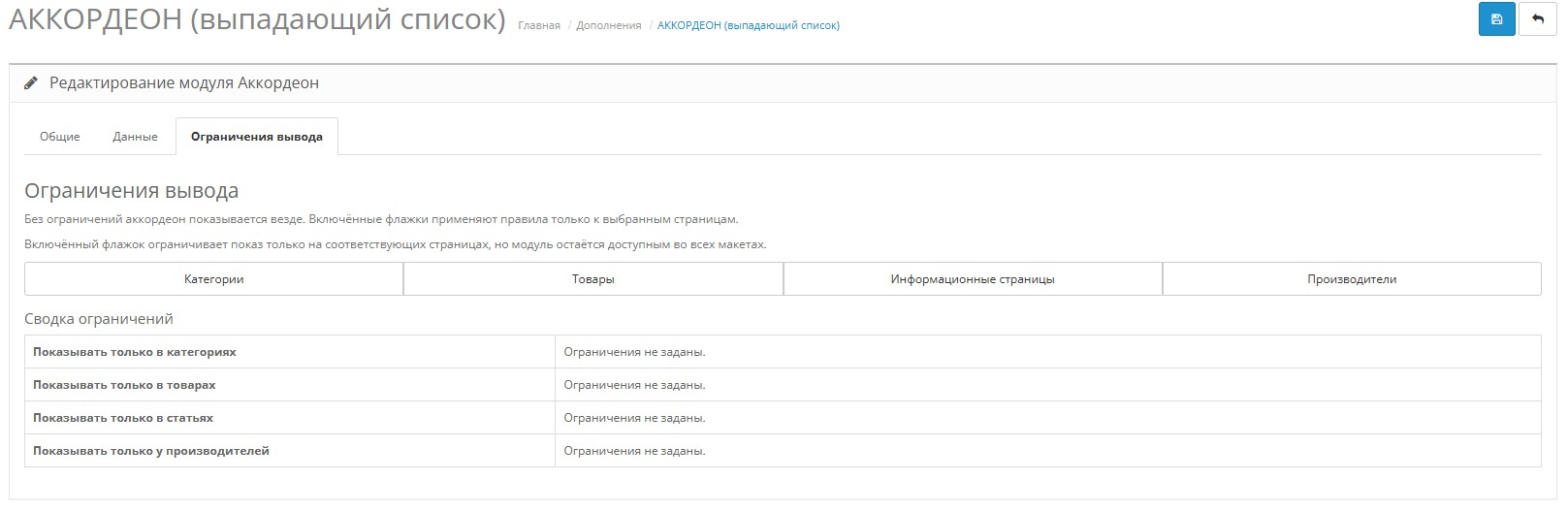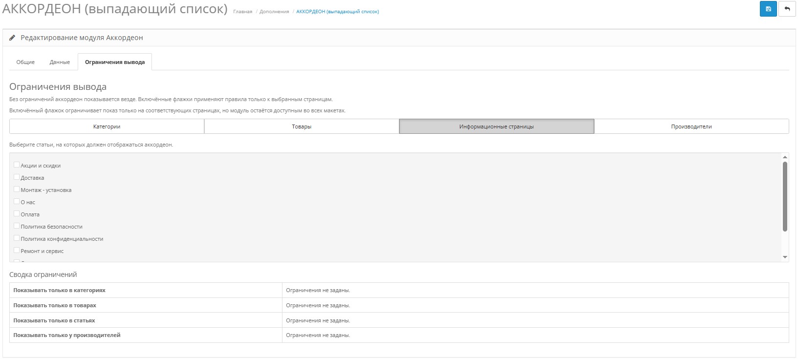 Ограничения помогают выводить модуль только там, где нужно: по категориям, товарам, производителям, информационным страницам или через отдельный список исключений. Включите нужные вкладки в разделе «Ограничение вывода», чтобы не плодить аккордеон на ненужных страницах.
