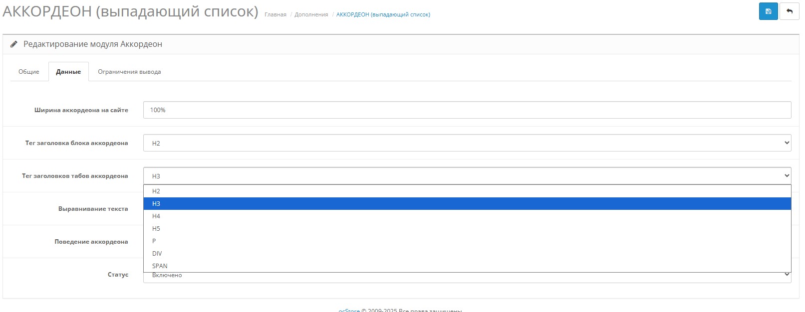- Для заголовка всего блока и для заголовков табов можно выбирать разные теги (H2–H5, p, div, span), чтобы подстроить семантику под страницу.