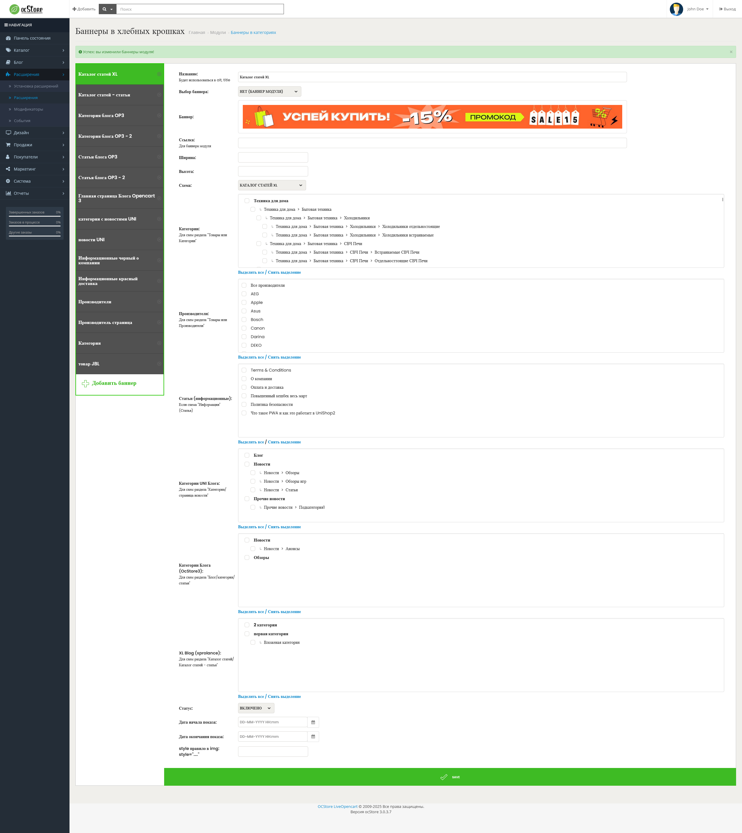 Модуль позволяет вывести баннеры под хлебными крошками в товарах, категориях продукта, блогах и информационных статьях, а так же при оформление заказа.