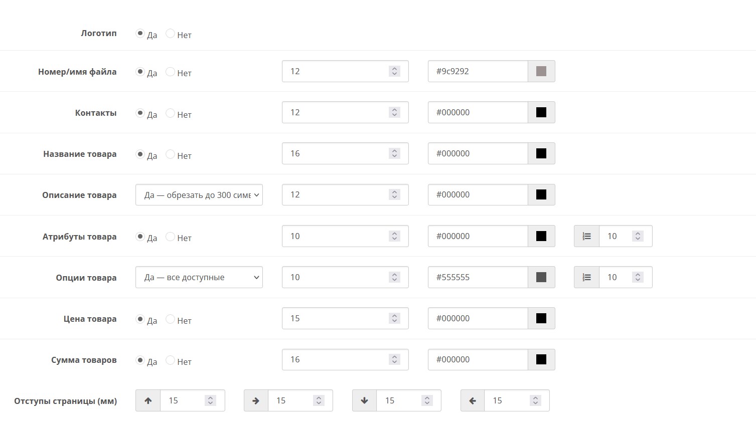 - гибкой настройки внешнего вида документов (шрифты, цвета, логотип, отступы, переносы описания) без правки кода