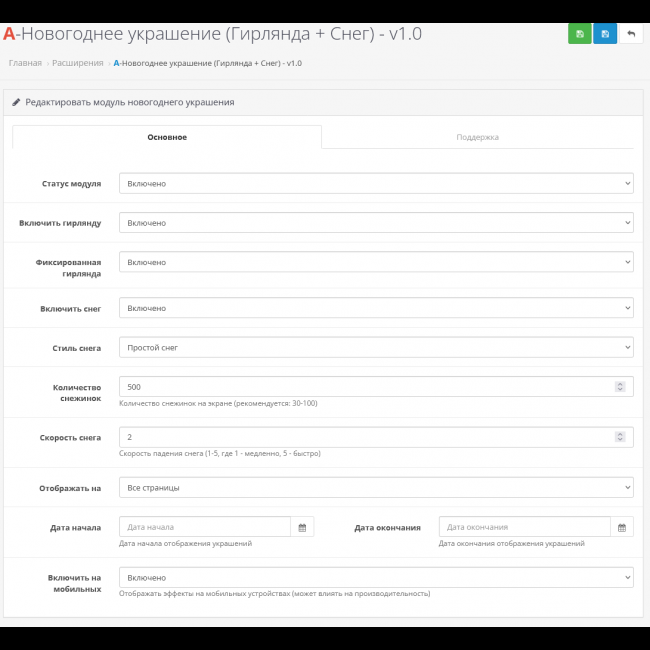 - После перейдите в расширения->модули и найдите "A-Новогоднее украшение (Гирлянда + Снег)" активируйте его;