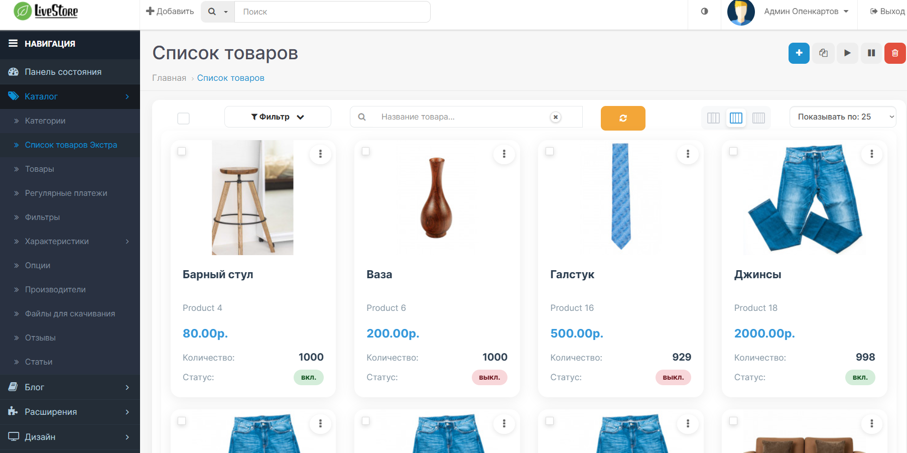Вместо стандартной таблицы используется карточный интерфейс (сетка), что делает работу с товарами более наглядной и быстрой.