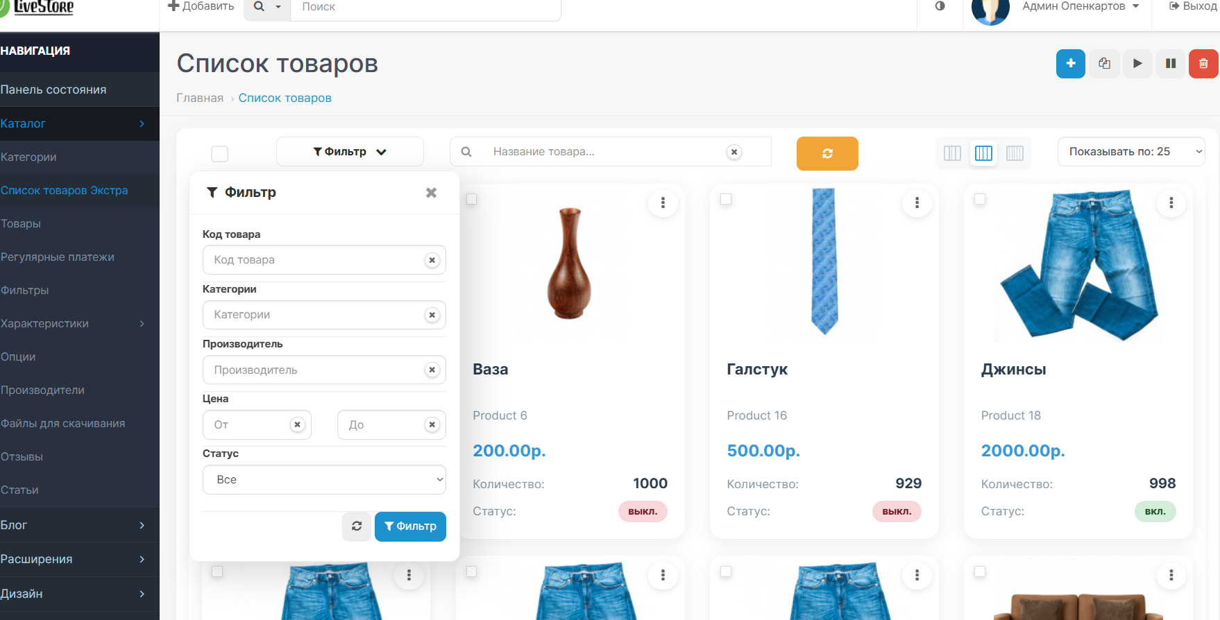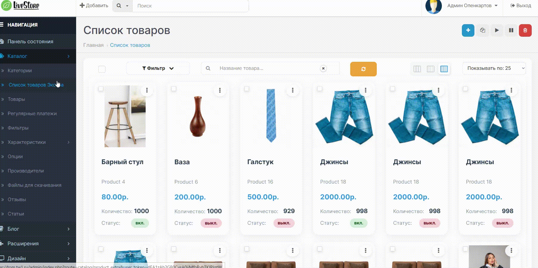 - Массовые операции: Возможность массово копировать, удалять товары или менять их статус.