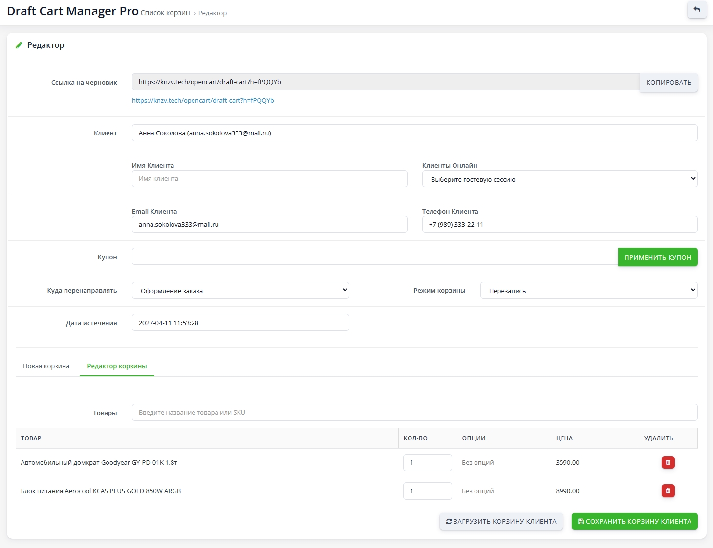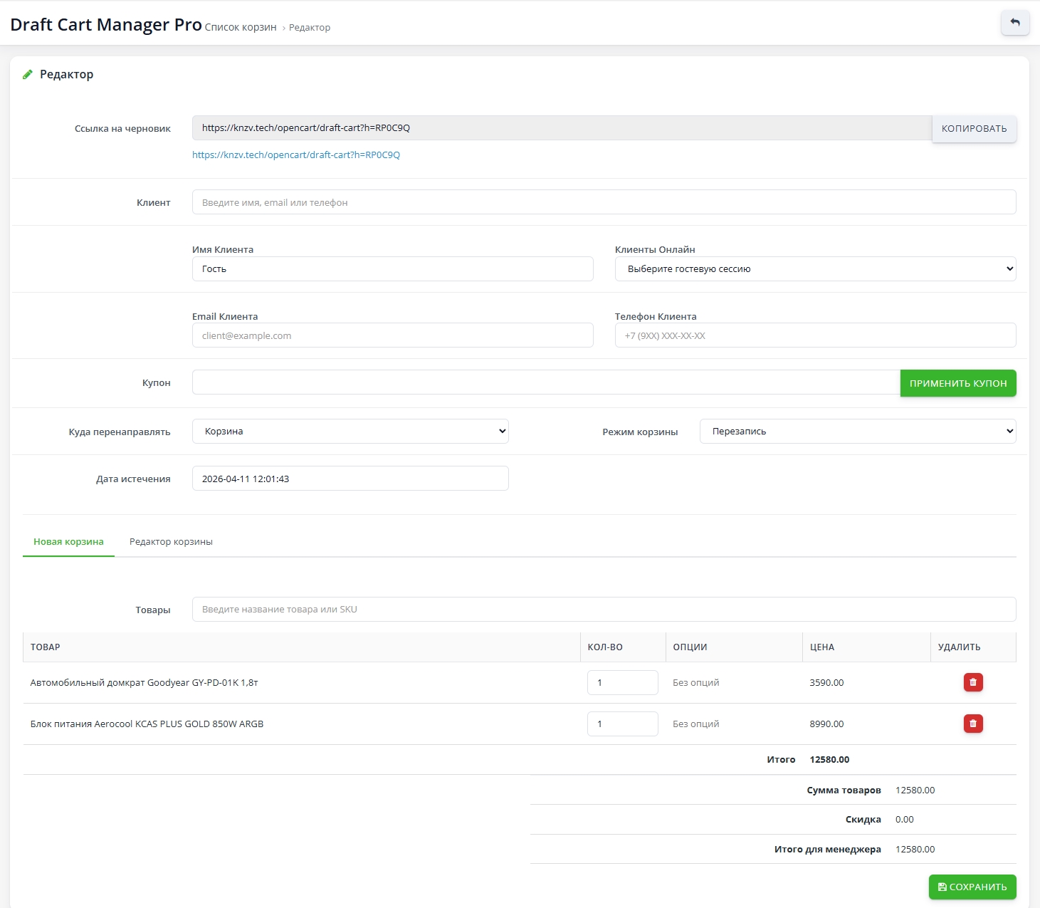 В админ панели вы создаете «черновик» корзины: быстрый поиск товаров по названию, изменение количества, выбор нужных опций и проверка итоговой суммы с учетом скидок и купонов.