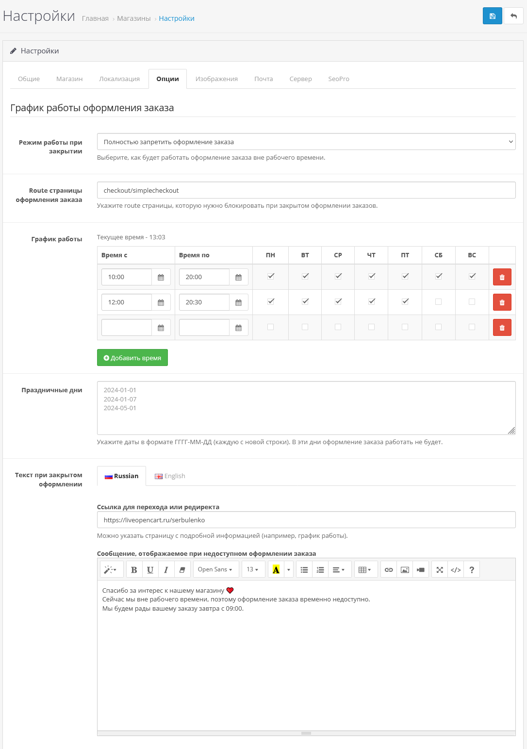 - Ограничение оформления заказа по времени