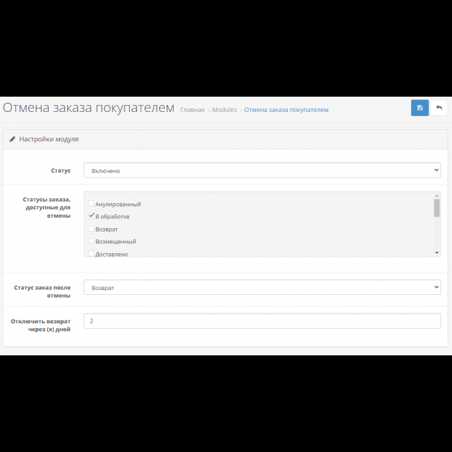 - Настройка доступных статусов для отмены: Модуль позволяет выбрать определенные статусы заказов, при которых возможна отмена. Например, если заказ уже оплачен, вы можете запретить его отмену, минимизируя риск потери средств.