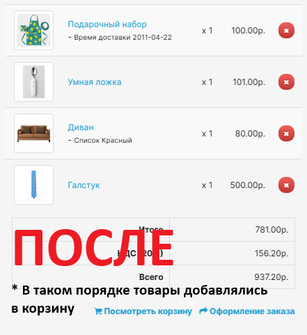 Сортировка товара в корзине по дате добавления.