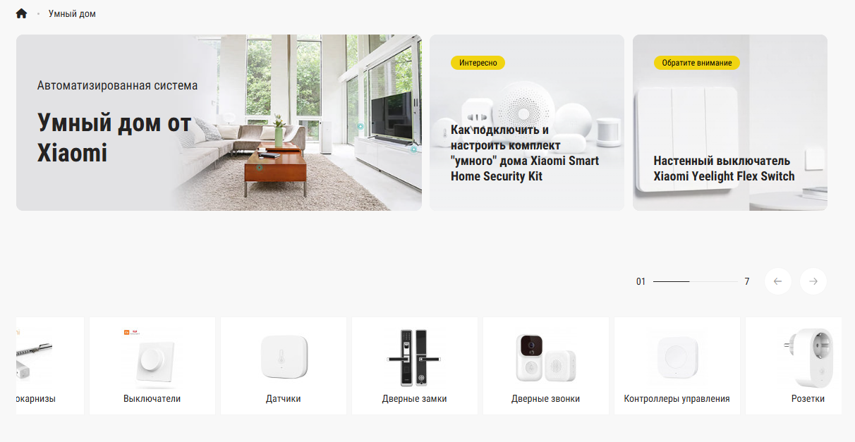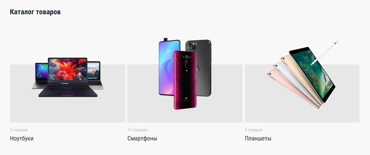 - Категории - карусель выбранных категорий с изображением, названием и количеством товаров;
