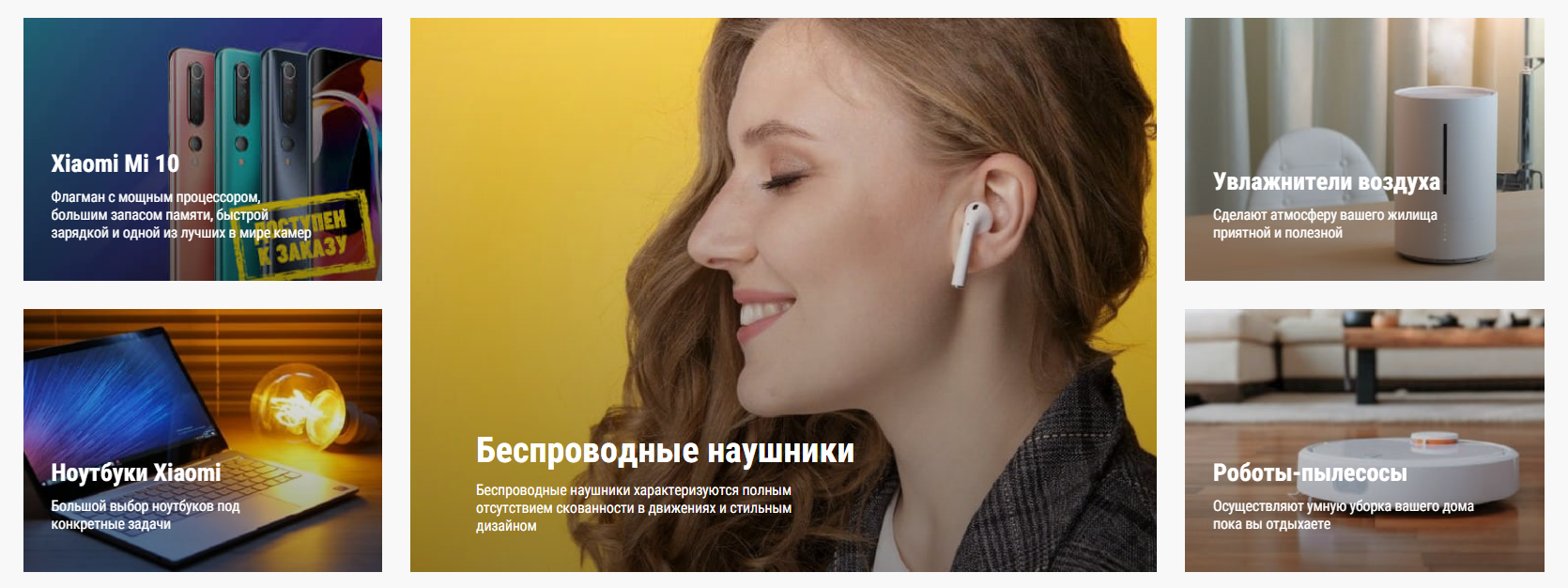 - Промо-блоки - 5 баннеров в журнальной сетке (2 малых + 1 крупный + 2 малых) с заголовками, описаниями и ссылками. На мобильных автоматически превращается в карусель;