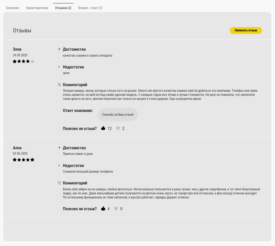 - Отзывы о товаре - всплывающее окно для написания отзыва с полями «Достоинства / Недостатки» и галочкой согласия на обработку данных;